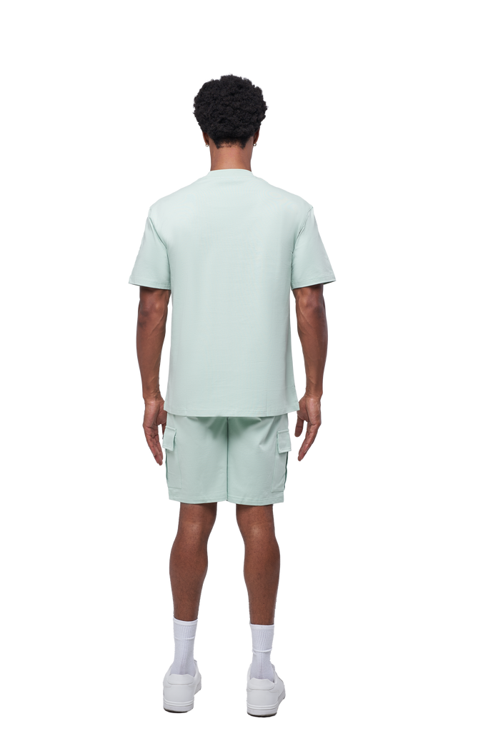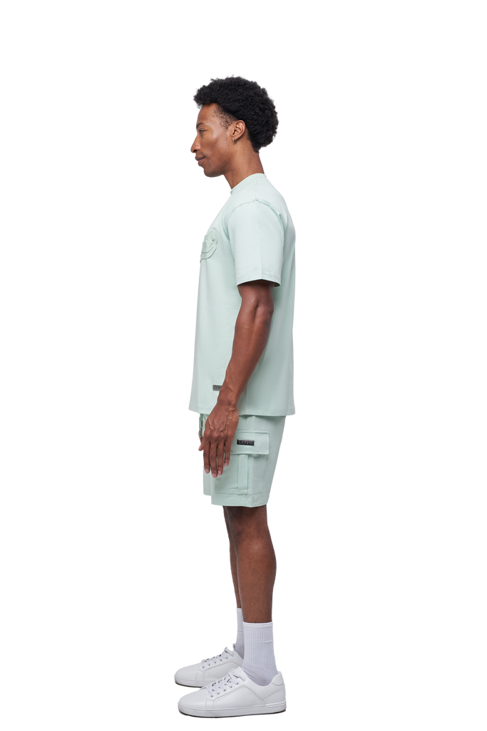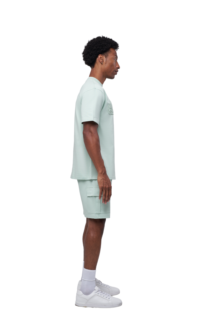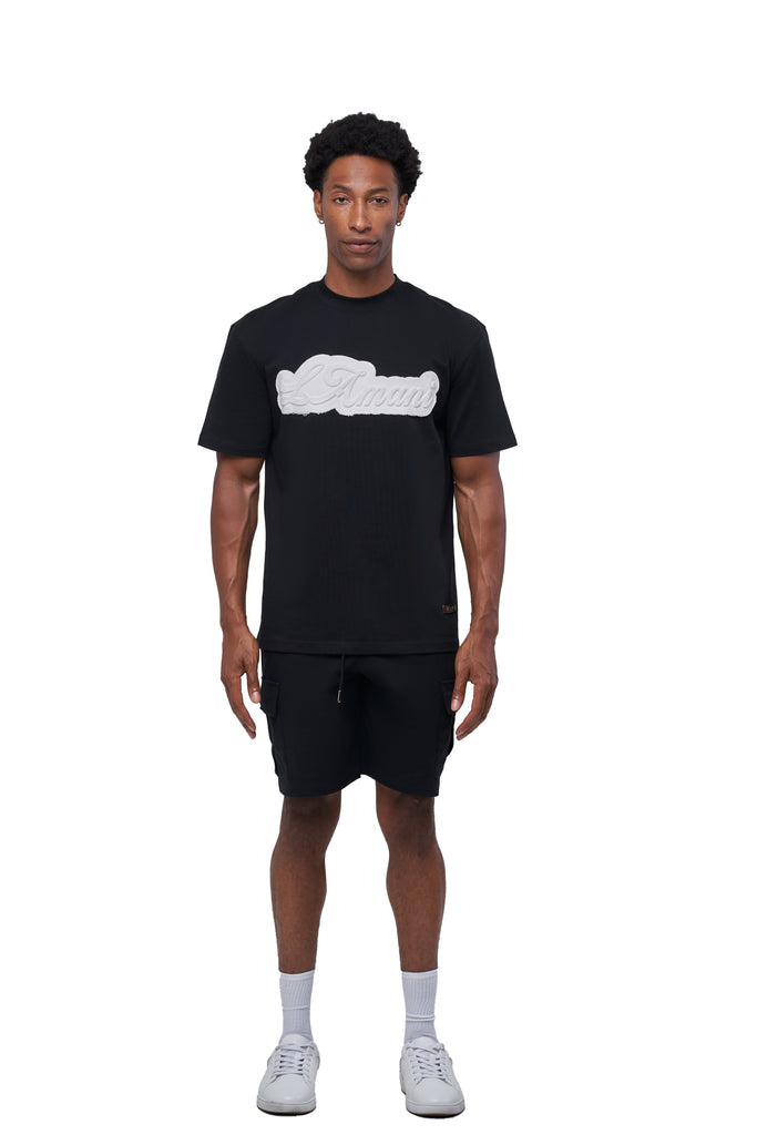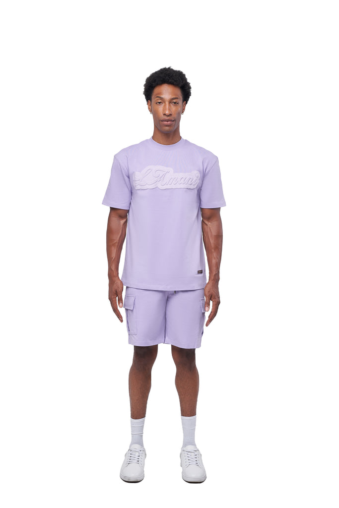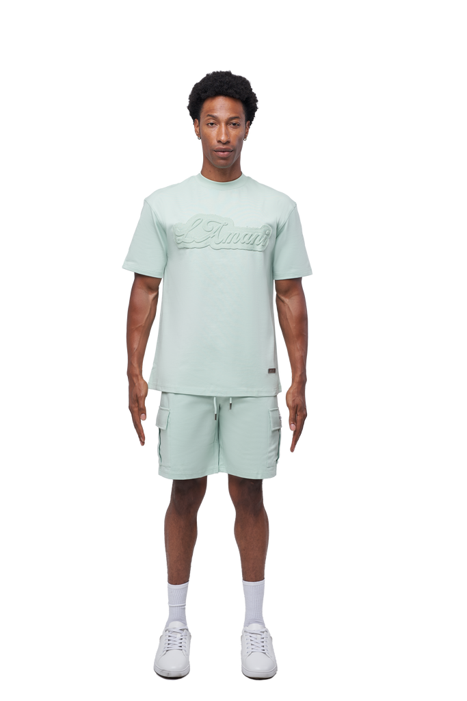 The embossed LAMANI chest logo adds a refined touch, while the metal custom logo detail on both the chest and cargo shorts elevates the look with luxury streetwear appeal. The cargo shorts feature a versatile design for everyday wear, blending durability with all-day comfort.